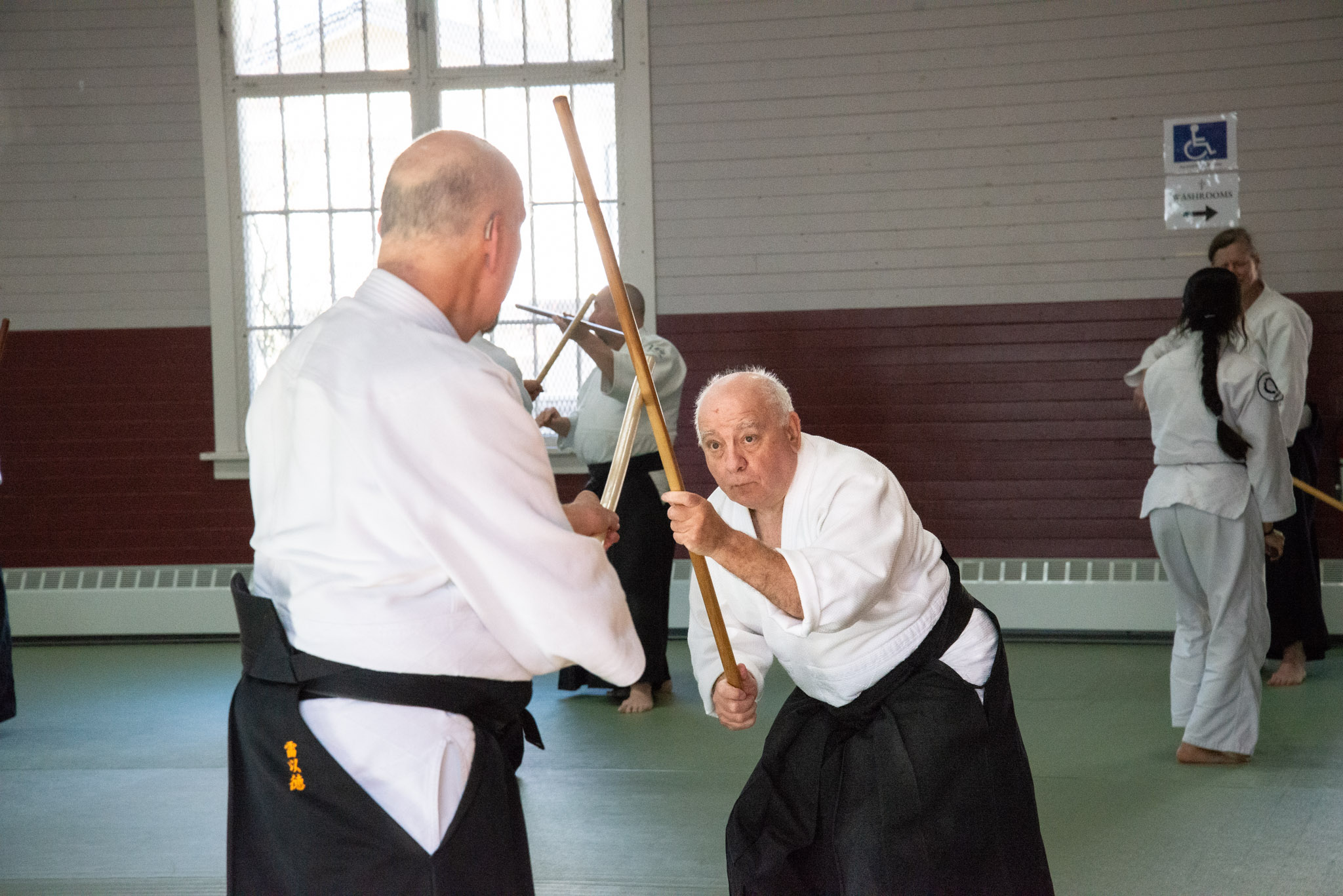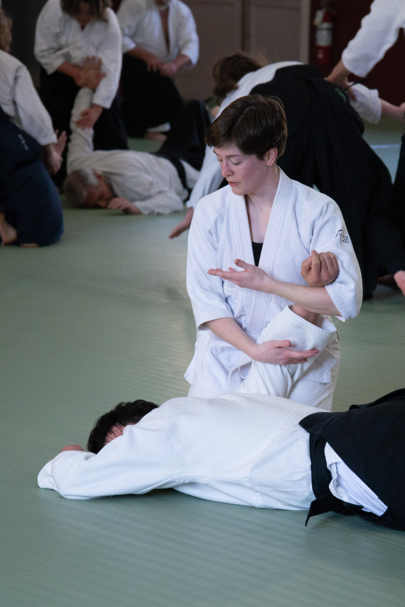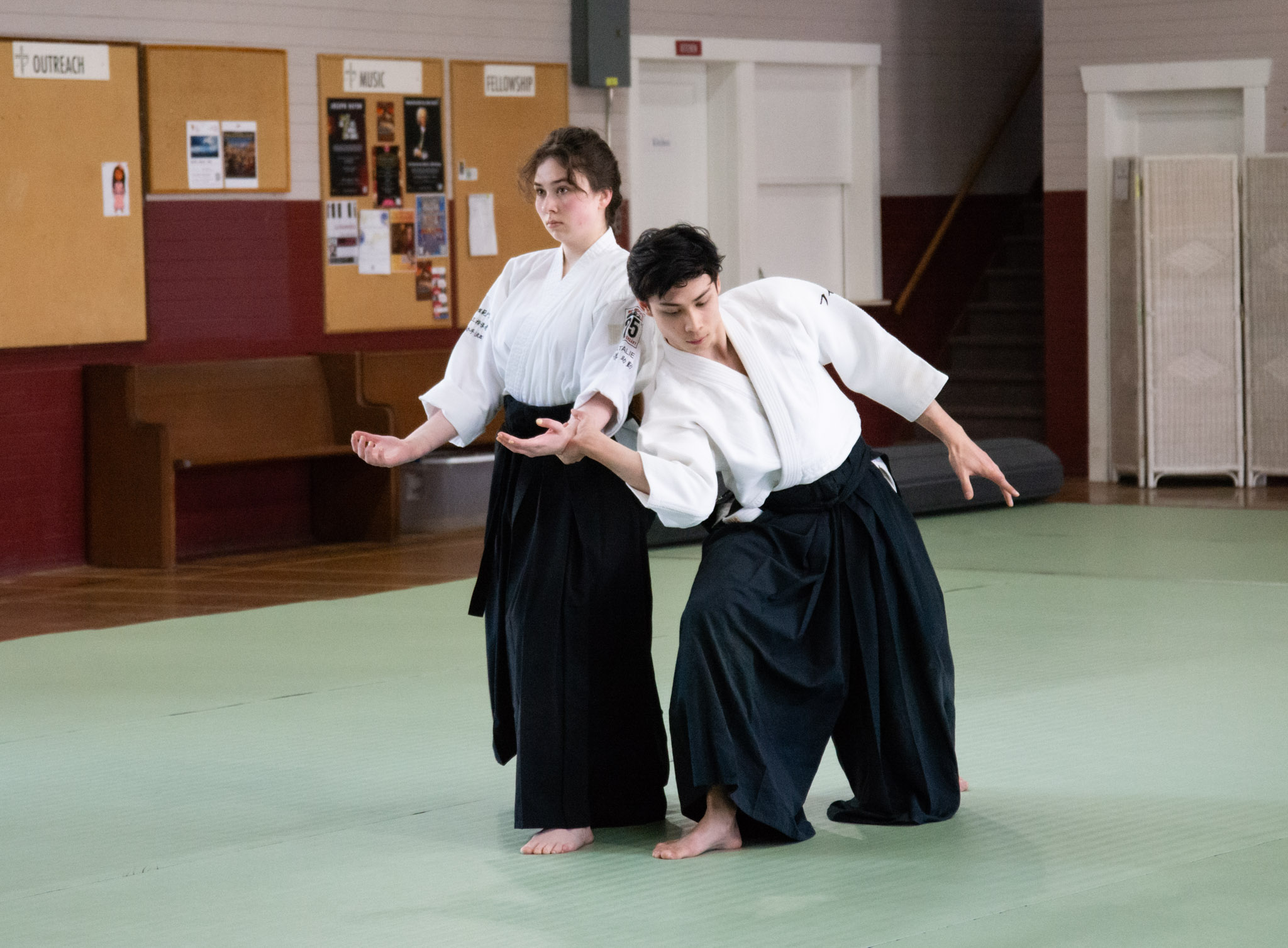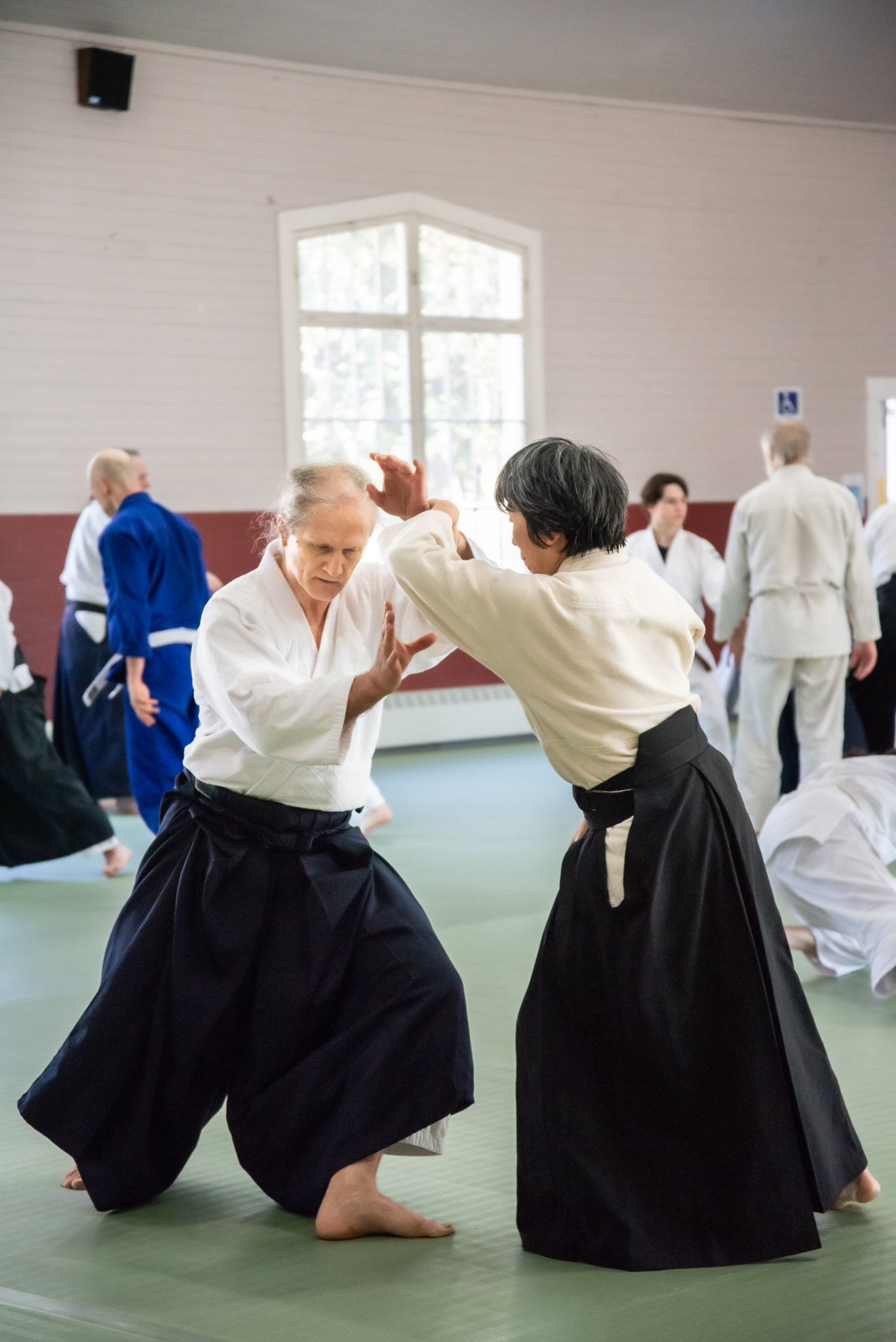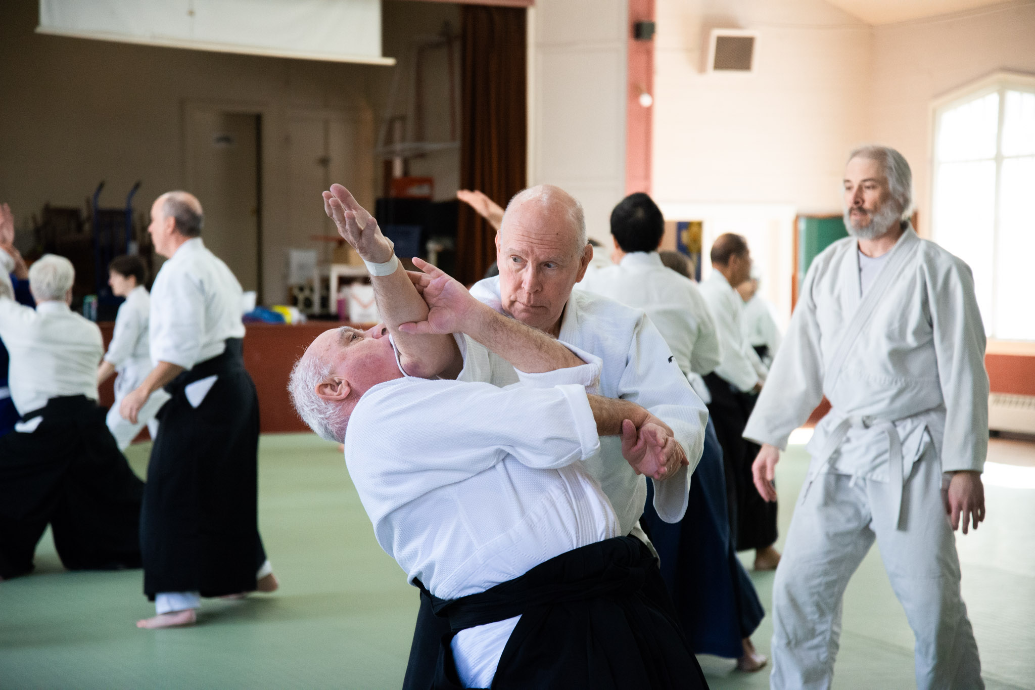 People practise aikido for many reasons. Some seek to improve their physical fitness, flexibility, and coordination; some endeavour to develop precision and power in a martial art; others are interested in exploring the connection between mind and body. Whatever your goals are, persistent and sincere aikido practice will help you cultivate awareness and polish your entire self. Aikido does not include competitions – students of all ages, fitness levels, and experiences train together. Half of aikido practice is dedicated to applying techniques; the other half is focused on protecting oneself and falling safely. With time, practice grows in depth, speed, and intensity.